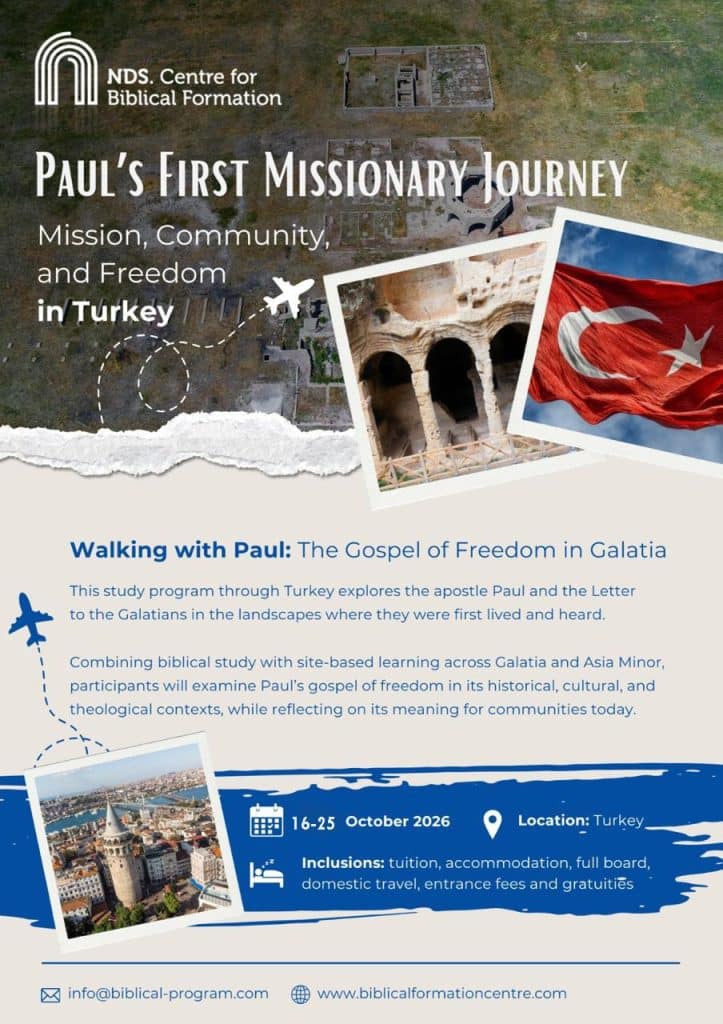 A series of guided presentations on Galatians exploring themes of freedom, law, community, and identity in the earliest Christian communities will be complemented by visits to key Pauline sites, including Tarsus, Pisidian Antioch, Iconium (Konya), Antalya (Attalia), Aspendos, Antioch on the Orontes, and the wider Galatian region, allowing the land itself to inform the reading of the text.