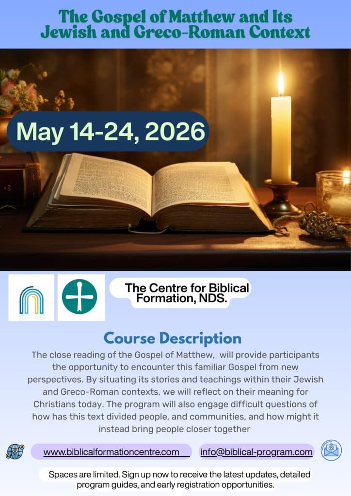 The course provides a panoramic overview of the context of the Christian communities that gave rise to the texts of Matthew, with all their complexity, diversity, and plurality. Through an in-depth study of the texts and their message, exploring tools to interpret them, students will gain insight into contemporary realities and discover the enduring relevance of the Gospel today.